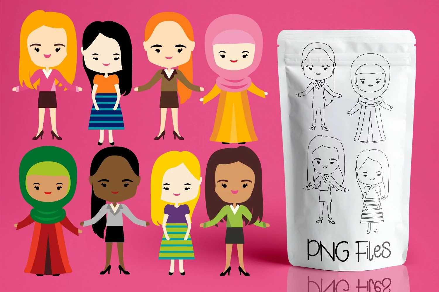 People illustrations set featuring multi ethnic women. The pack features multi ethnic women. This clip art collection is suitable for profession and multicultural theme projects.