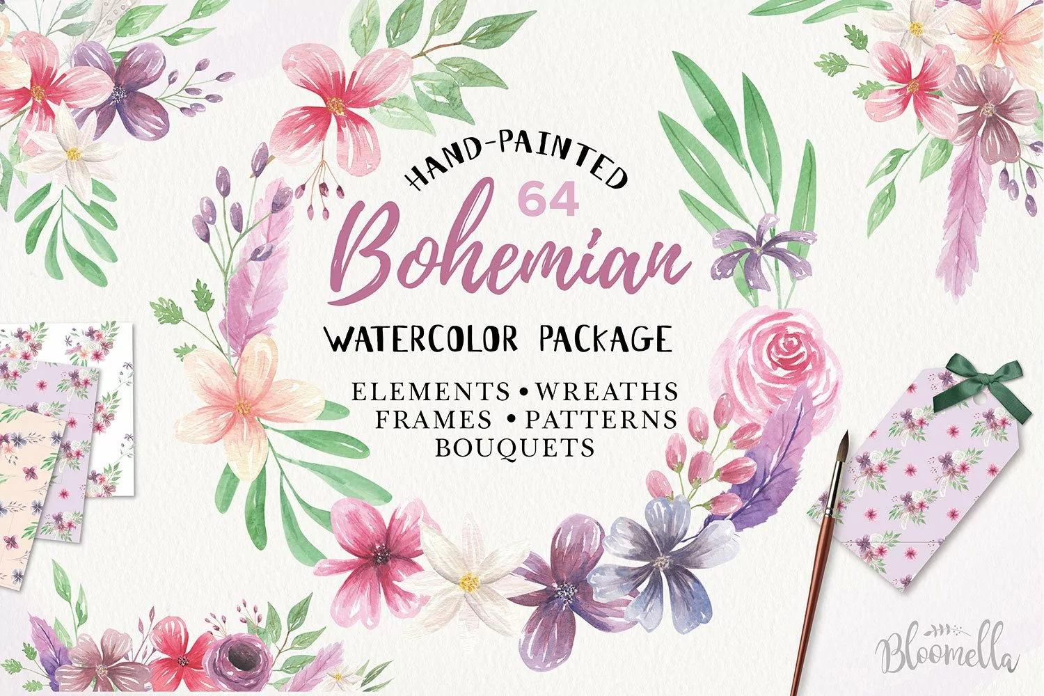 This Bohemian Package contains 64 pieces of hand-painted elements, wreaths, frames, bouquets & seamless patterns.
