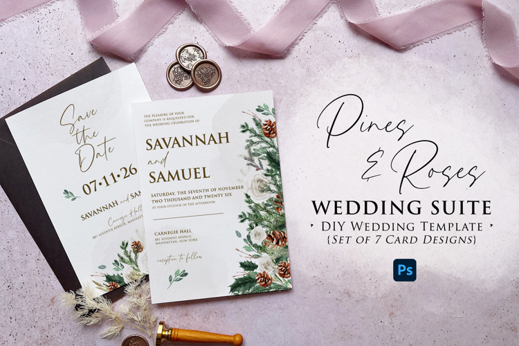 Watercolor Wedding Invitation Rustic Wedding Invite Winter Wedding Suite Editable Wedding Set Botanical Wedding Design Pine Wedding Template White Rose Stationery Elegant Floral Template Watercolor Greenery Invitation Nature Inspired Wedding