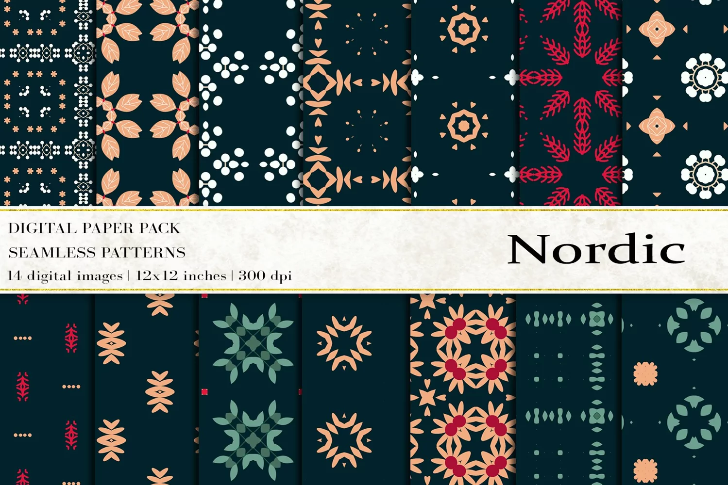 Nordic Digital Papers. This set of 14 Nordic, Scandinavian Seamless Pattern.
