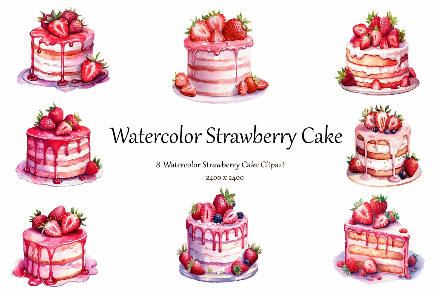This set includes: 8 Watercolor Strawberry Cake Clipart. Transparent Background, Png Files, 2400×2400 pixels