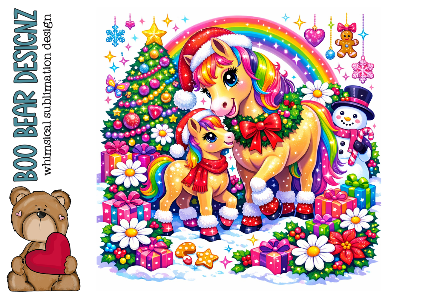 Bring a touch of pure magic to your projects with Rainbow Meadow Unicorn. This cheerful unicorn design features a bright rainbow mane and tail, delicate flowers, Christmas themed, and a dreamy pastel color palette that radiates joy and whimsy. Inspired by my lifelong love of horses, this design blends the innocence, strength, and beauty I see in them every day with a playful, fairytale twist.