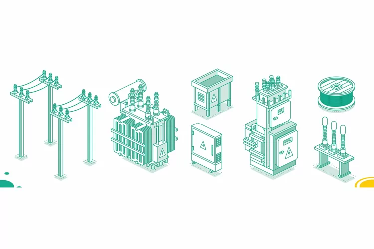 Isometric Electrical Transformer Set. Outline Energy Objects. Vector Illustration. High-Voltage Power Substation Isolated on White.