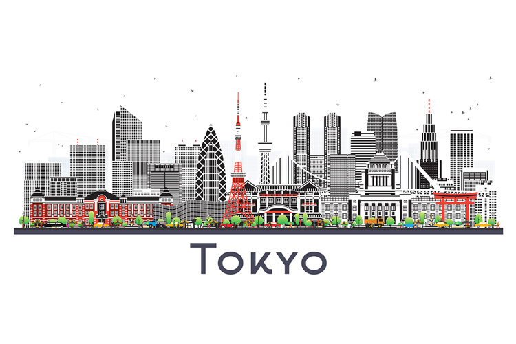 Tokyo Japan city skyline with color buildings isolated on wh