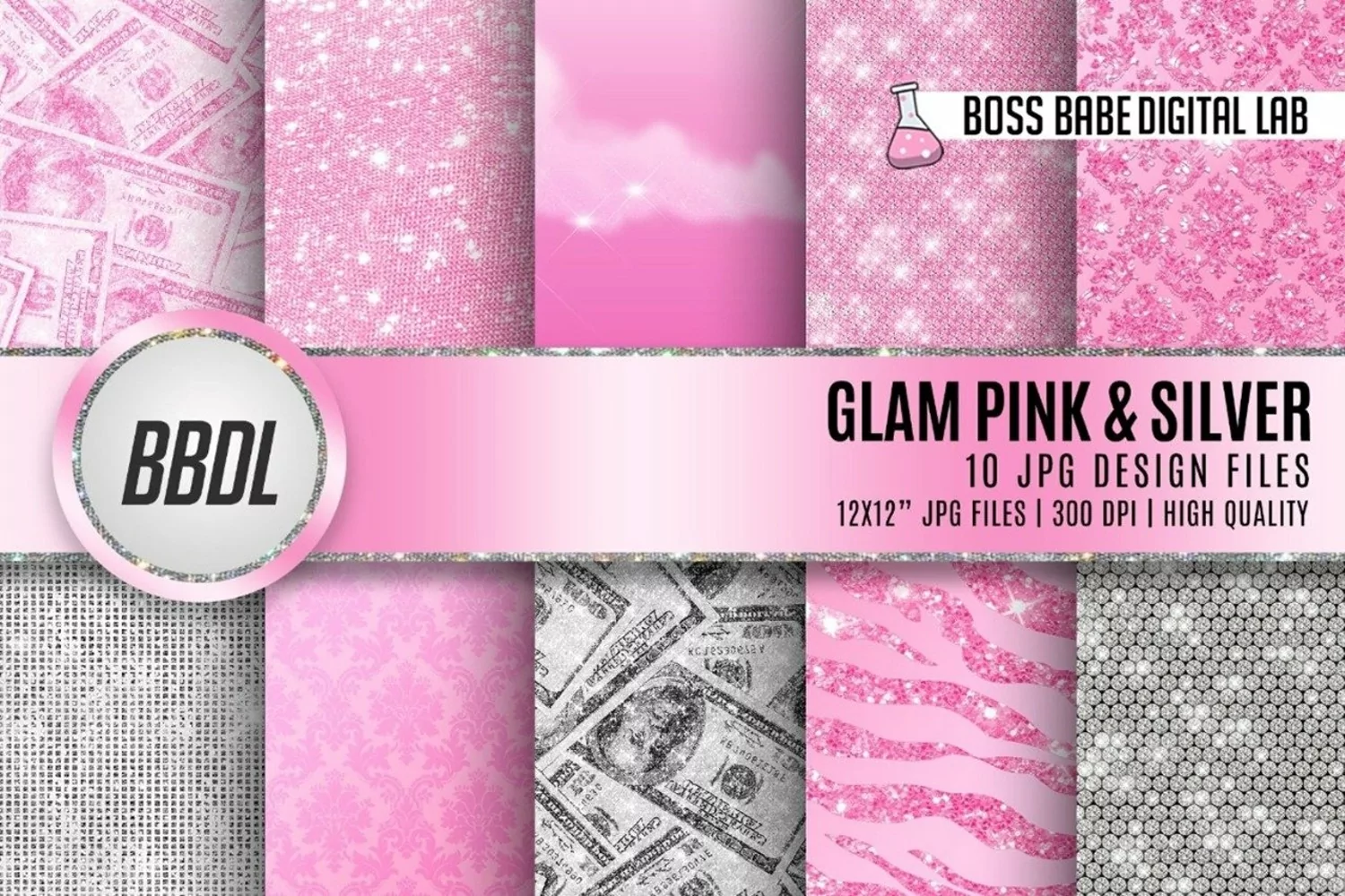 10 Dolly Pink and Silver Glam, Dolly Pink and Silver Glam Digital Papers, 12" x 12", 300 dpi JPGs, Instant Download Dolly Pink and Silver Glam