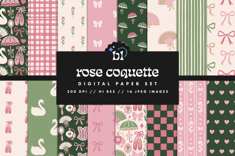 These Rose Green Coquette patterns are great for projects such as invitations, business cards, scrapbook elements, blog elements, merch, and more!