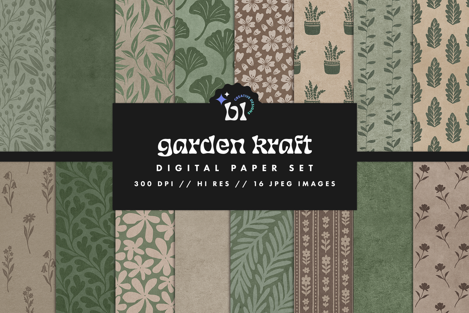 These earthy green kraft patterns are great for projects such as invitations, business cards, scrapbook elements, blog elements, merch, and more!