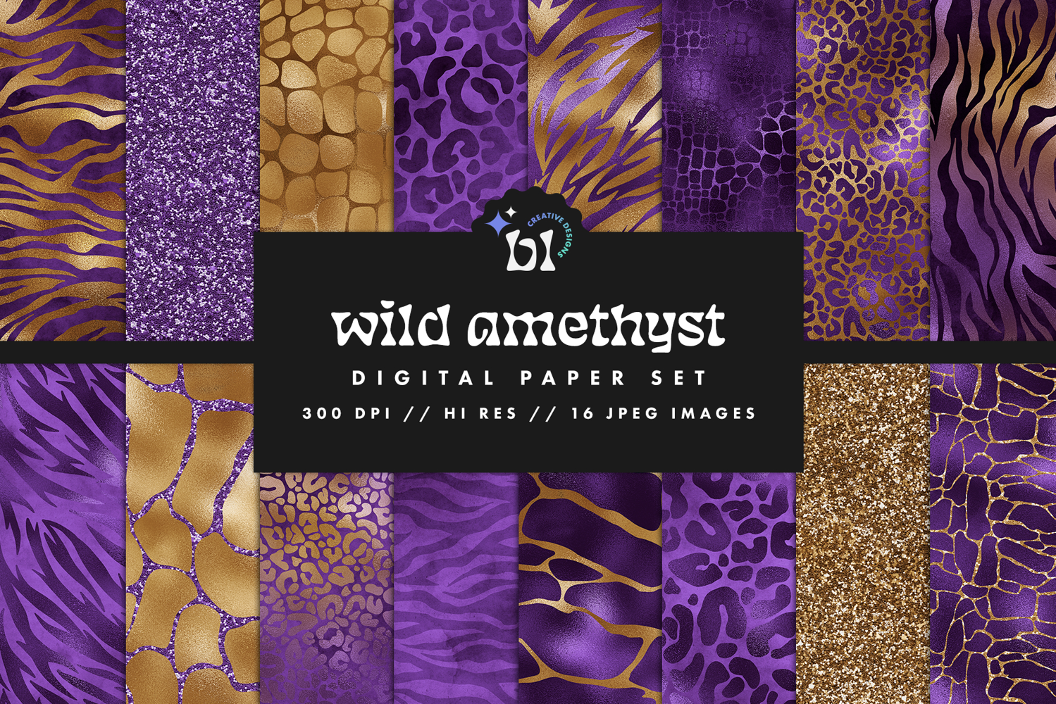 These gold and purple safari and animal print patterns are great for projects such as invitations, business cards, scrapbook elements, blog elements, merch, and more!