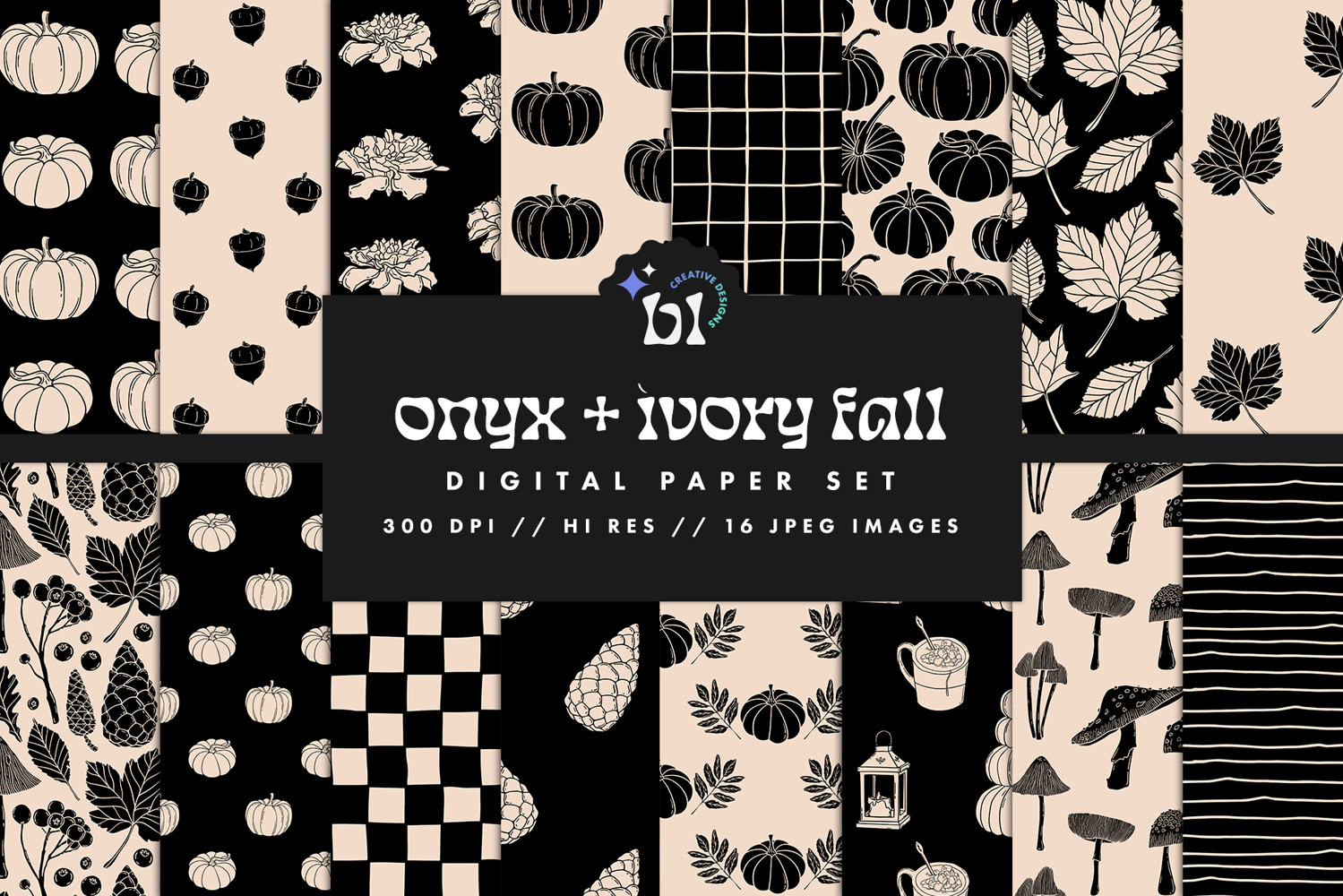 These fall black & ivory patterns are great for projects such as invitations, business cards, scrapbook elements, blog elements, merch, and more!