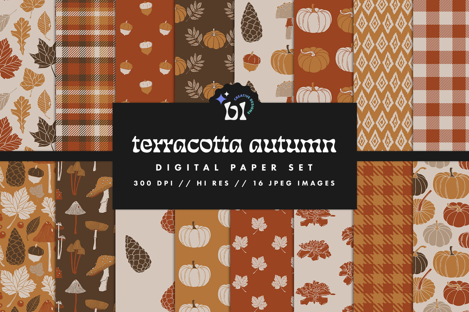 These terracotta fall patterns are great for projects such as invitations, business cards, scrapbook elements, blog elements, merch, and more!