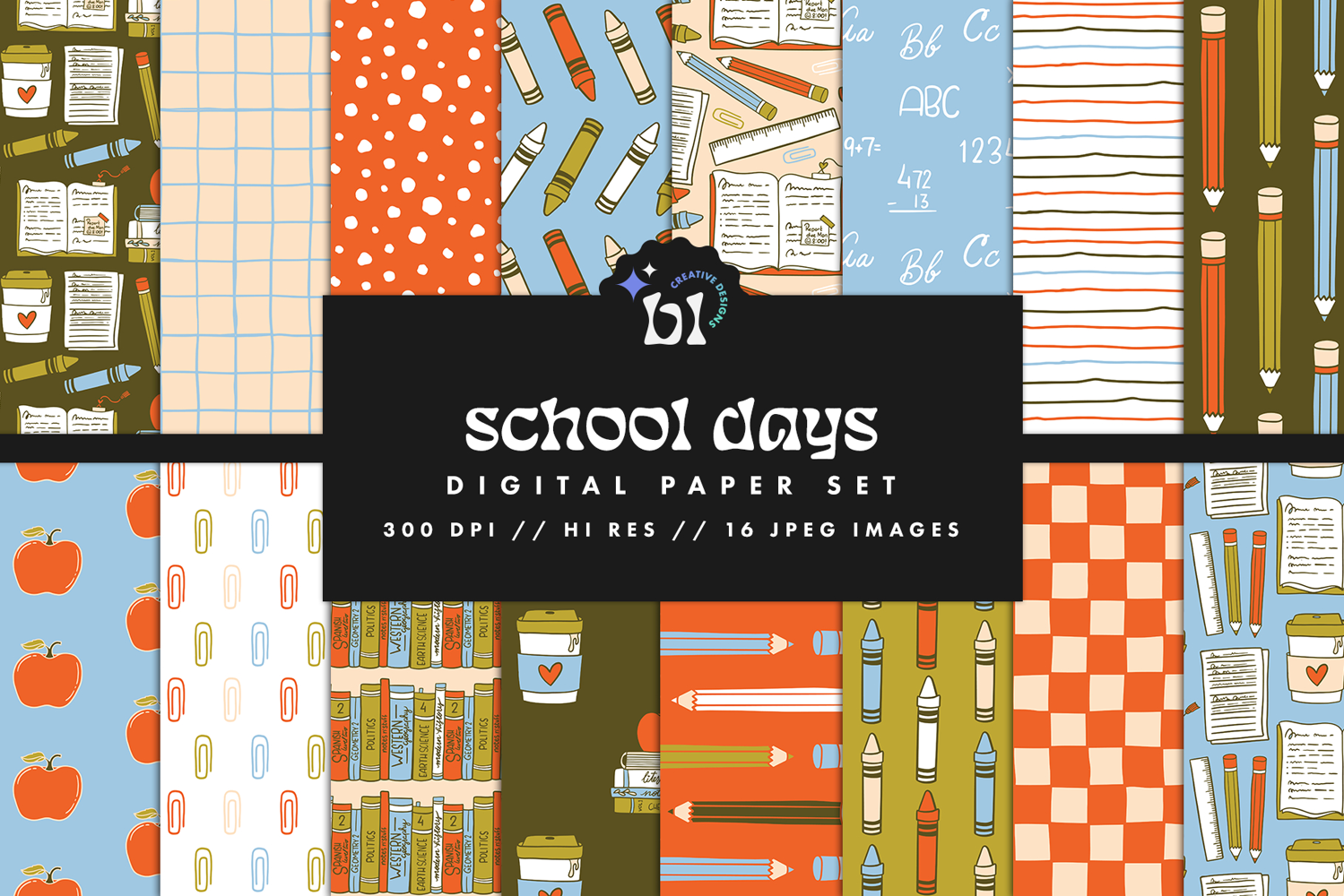 These cute school patterns are great for projects such as invitations, business cards, scrapbook elements, blog elements, merch, and more!