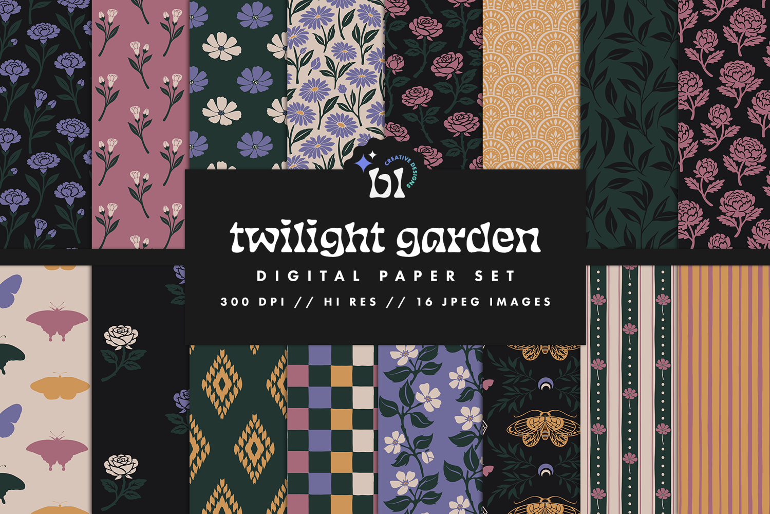 These dark and moody floral patterns are great for projects such as invitations, business cards, scrapbook elements, blog elements, merch, and more!