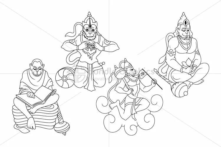 Set of 4 high quality black linear vector illustrations of Indian Hindu deity Rama's devotee Hanuman, also known as pawan putra. He participated in Rama's war against the demon king Ravana. Illustrations are showing Hanuman reading Ramayana, Hanuman showing Ram in his heart, Hanuman flying with flag written Shri Ram over it, and Hanuman meditating holding lotus in his hands. Gada a heavy club with a spiked metal head is common in all illustration due to it is the main weapon of Hanuman.