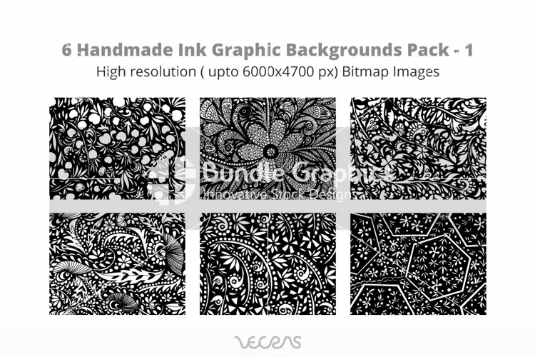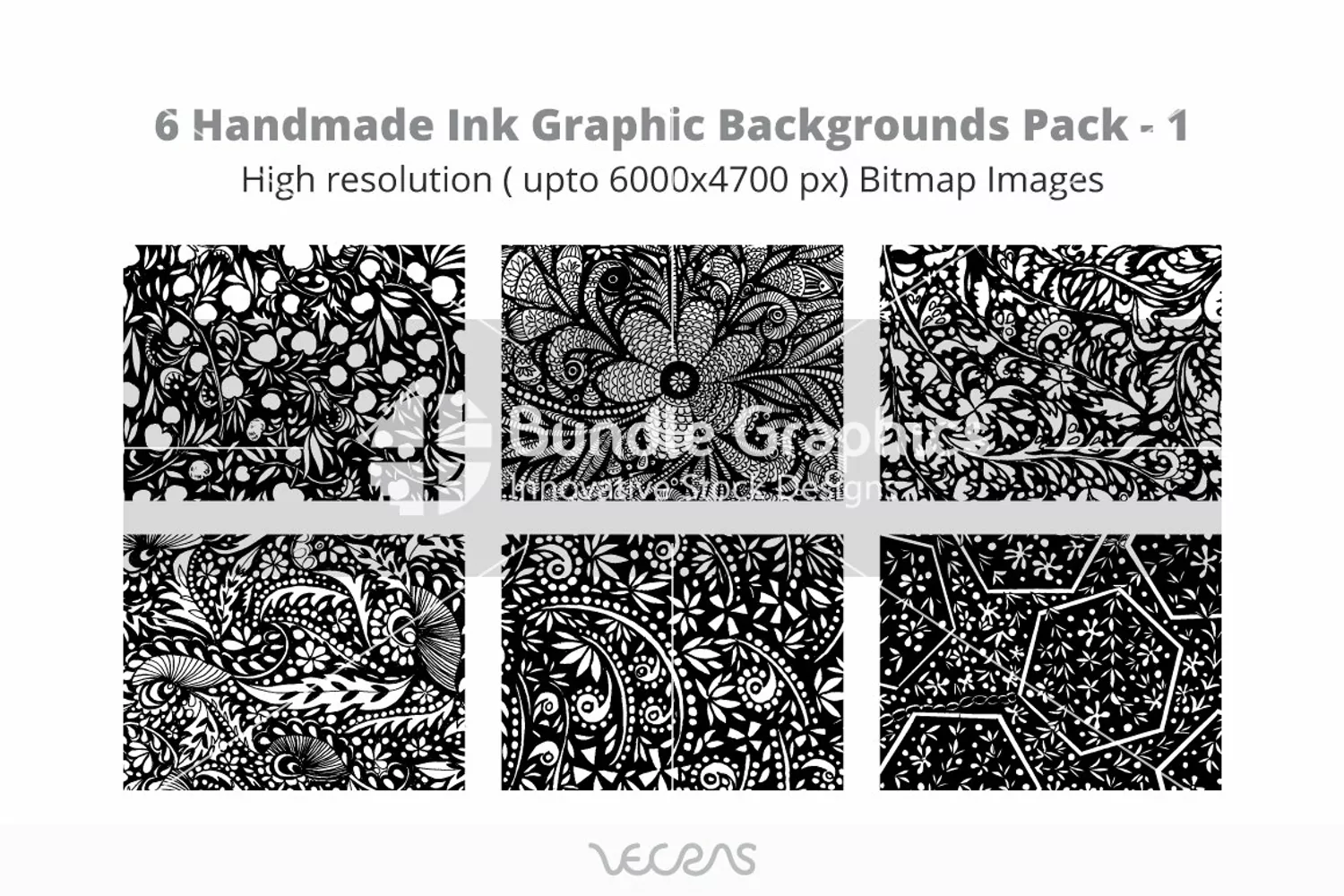 Handmade ink graphic illustrative backgrounds pack of 6 images available in TIF format. All graphics are made with black ink on paper. All images are showing different abstract graphics such are apple plants, decorative ornamental florals, ornamental nature, leaves, hexagons with nature elements, etc.