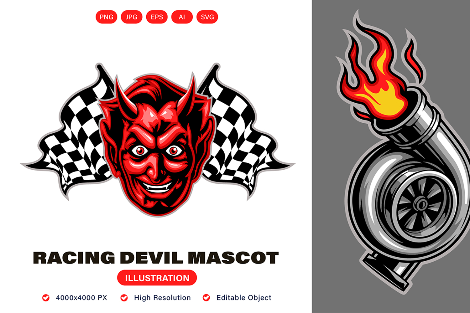 Racing Devil Mascot Illustration features a fierce red devil character combined with racing checkered flags and a flaming turbo element. Designed to represent speed, power, and adrenaline, this illustration is perfect for automotive branding, racing teams, motorsport logos, streetwear designs, stickers, posters, and merchandise. Fully editable, scalable, and ready for print or digital use.