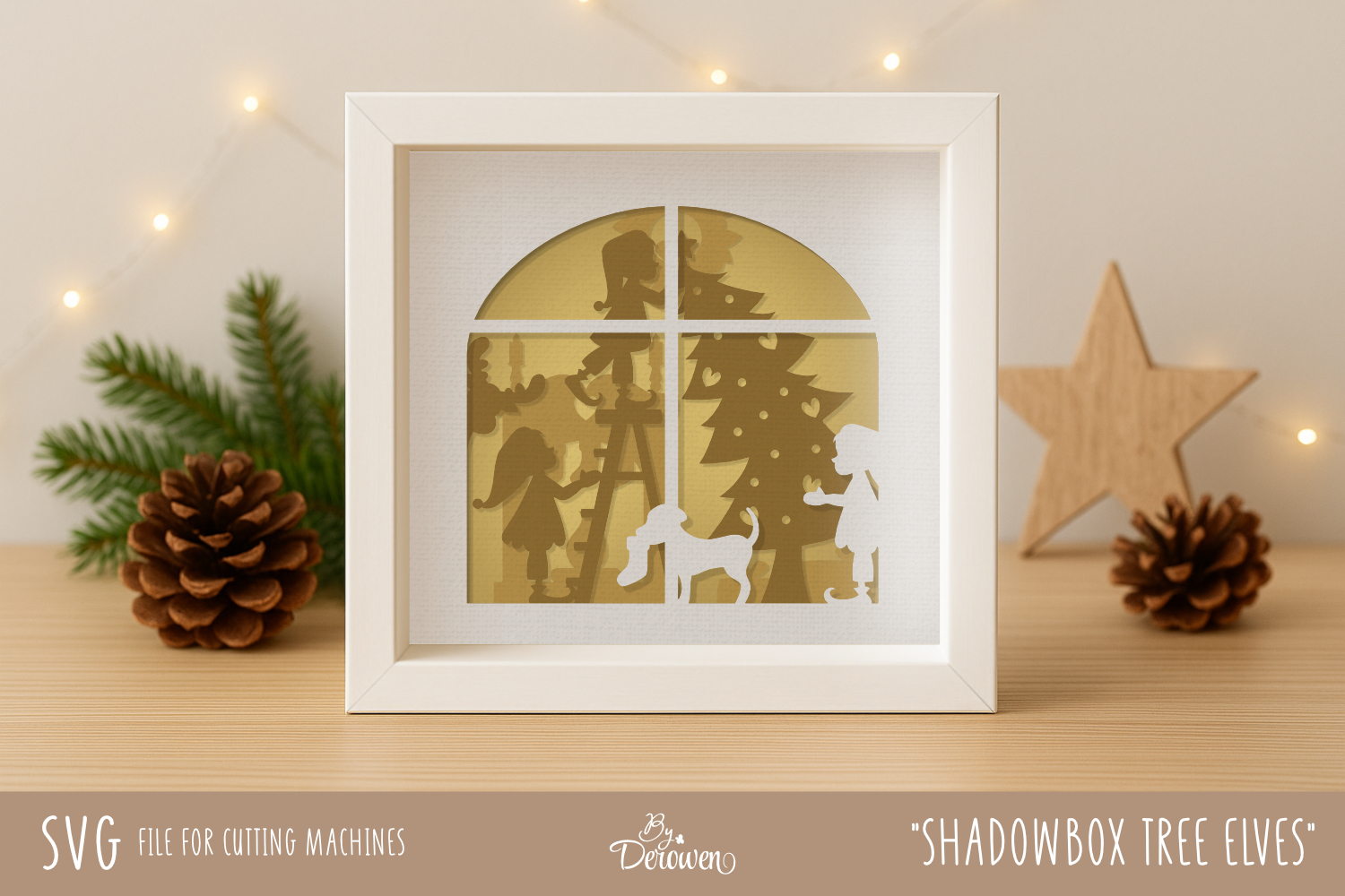 SVG cut file 3D Shadow box, Christmas Tree with Cute Elves - decorating a Christmas Tree.
