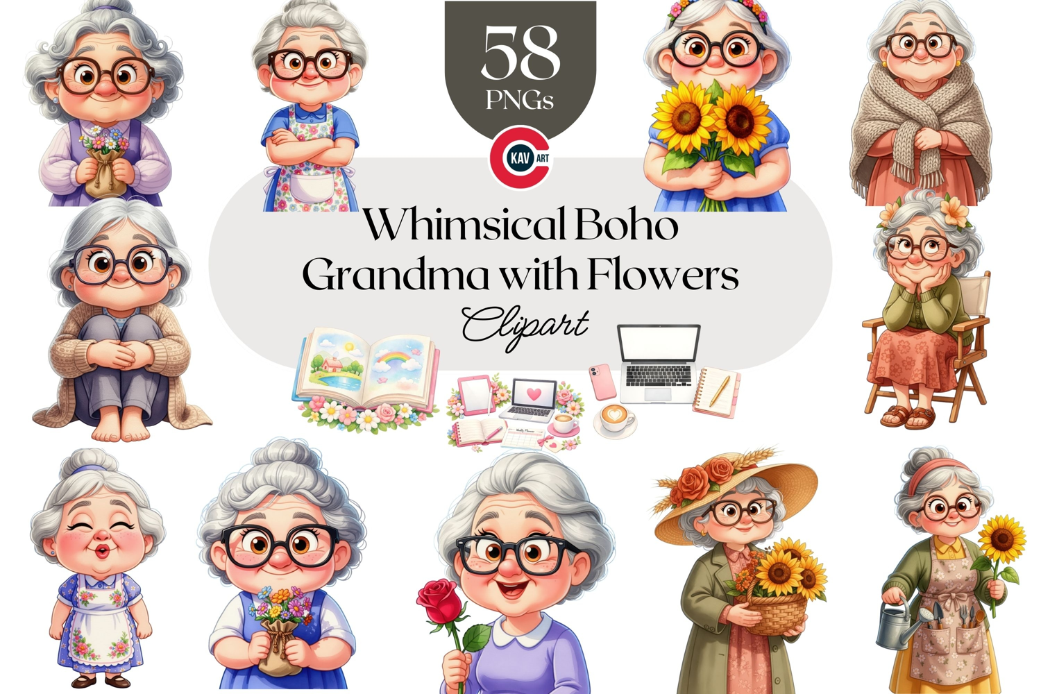These transparent PNG clipart illustrations are cleanly isolated with crisp edges for effortless layering and resizing. Whether you’re creating grandmother-themed gifts, cottagecore fashion designs, empowering age-positive merchandise, or aesthetic boho artwork, this collection offers versatile, ready-to-use graphics that save time while elevating your product designs.
