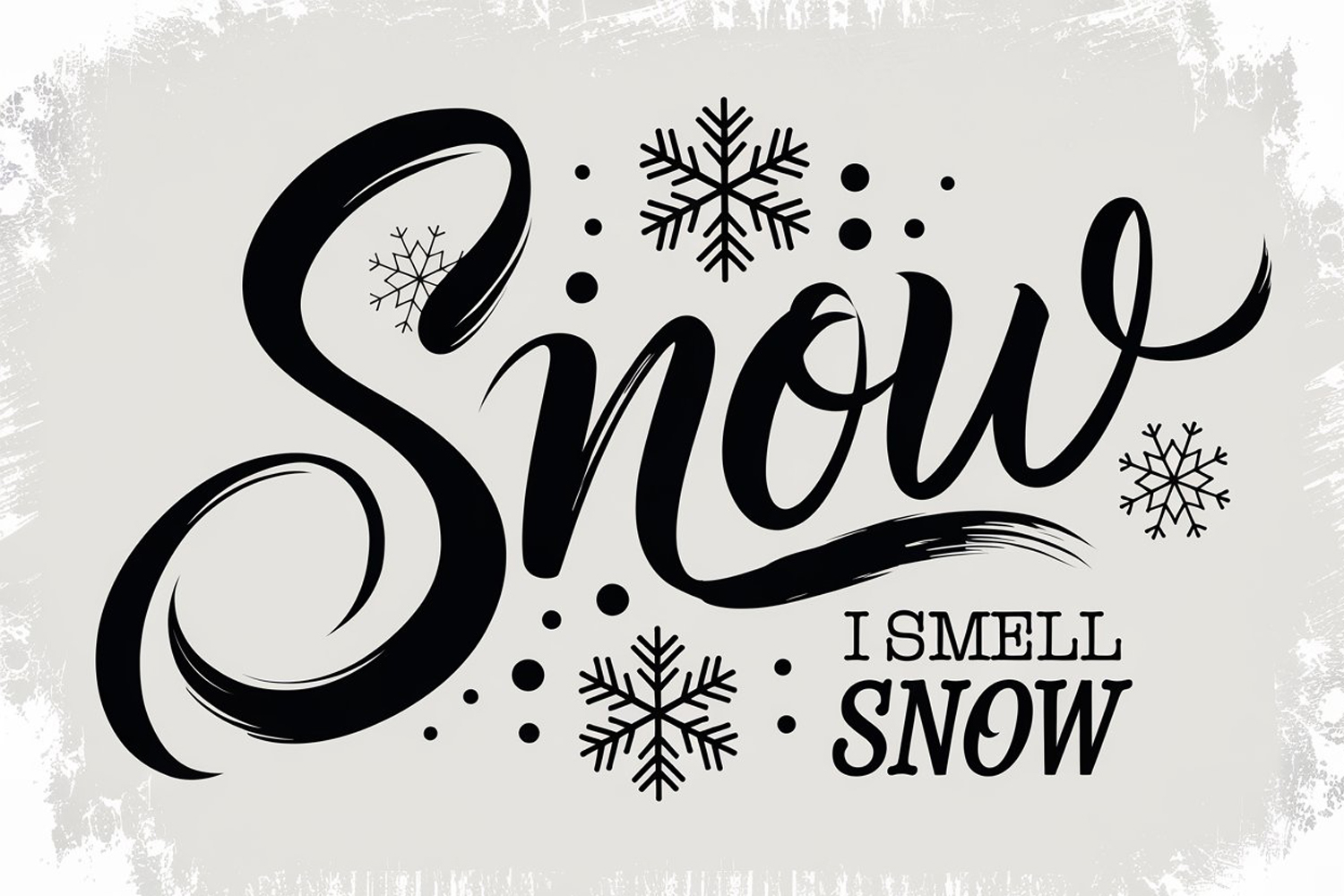 snow, winter, typography, handwritten, calligraphy, text, "I smell snow," festive, holiday, Christmas, seasonal, cold, flakes, snowflakes, black, white, design, graphic, artistic, creative, elegant, decorative, background, vintage, cozy, celebration, joy, wintertime, frost, ice, nature, whimsical, playful, cheerful, inspiration, quote, phrase, art, illustration, minimalist, stylish, modern, holiday spirit, greeting, card, poster, wall art, seasonal decor, winter wonderland
