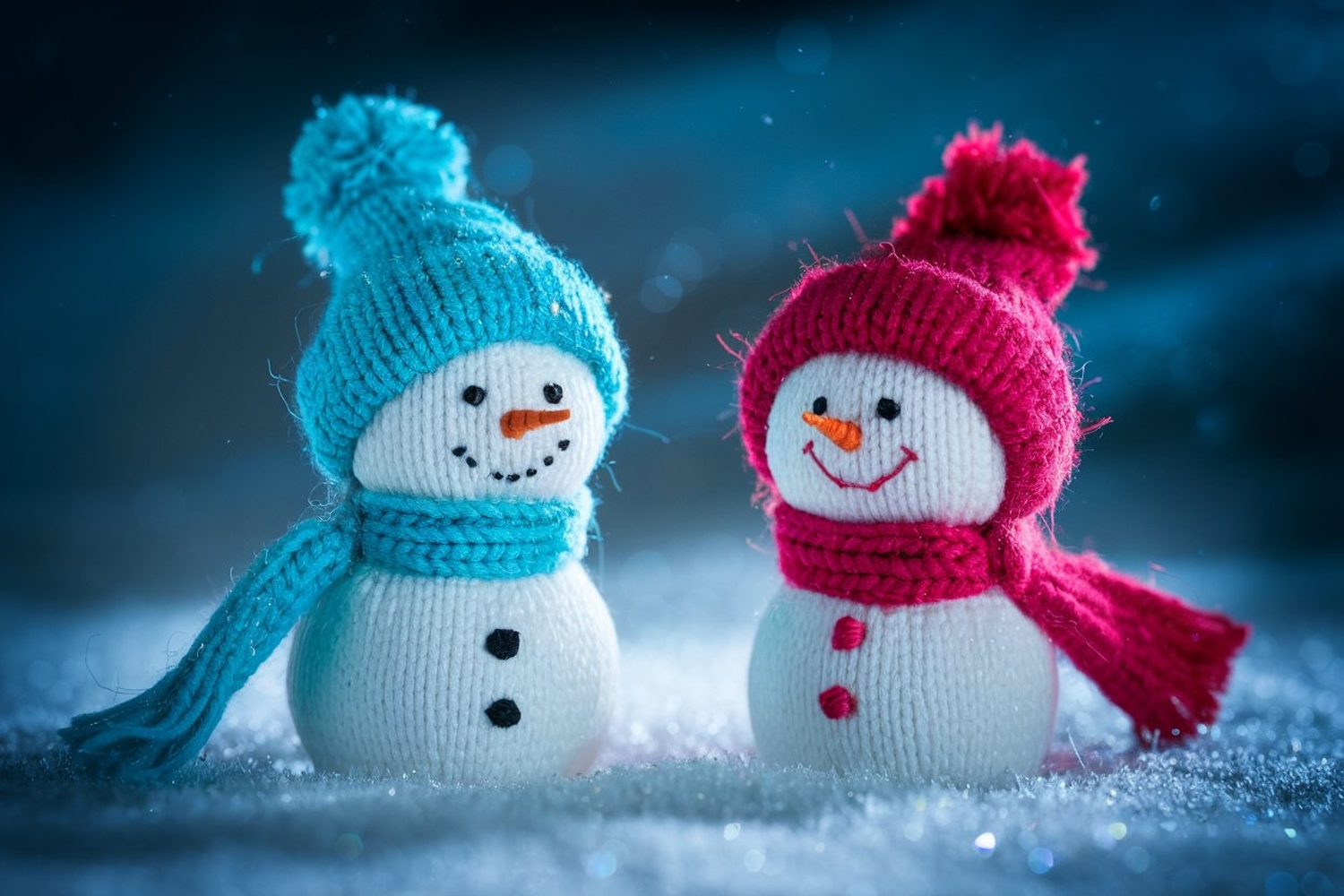 Two cheerful knitted snowmen wearing colorful hats and scarves in a snowy setting.