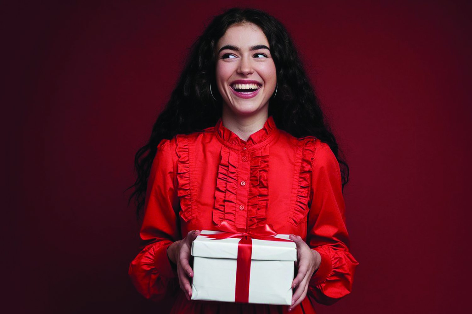 woman, smiling, happy, gift, box, red, ribbon, bow, joy, celebration, holiday, Christmas, present, surprise, festive, cheerful, positive, emotion, red blouse, ruffles, fashion, portrait, close-up, detail, texture, background, dark, contrast, artistic, creative, photography, inspiration, lifestyle, happiness, excitement, giving, receiving, gift box, red ribbon, festive mood, holiday spirit, cheerful woman, happy moment, red outfit