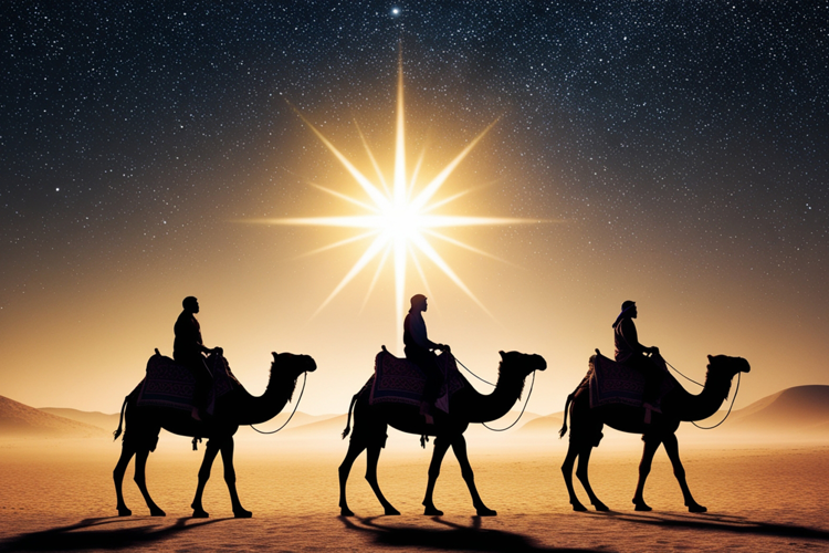 Three Kings Day, camels in desert, star of Bethlehem, biblical scene, night sky, religious journey, wise men, Christmas story, silhouette art, desert landscape, spiritual travel, holiday illustration, magical night, starry sky, camel ride, biblical illustration, Christmas tradition, mystical atmosphere, desert night, religious art, three wise men, holiday scene, spiritual journey, star guidance, festive illustration, biblical travel, nighttime desert, Christmas art, camel silhouettes, religious symbolism, holiday night, wise men journey, starry night, biblical holiday, desert travel, Christmas illustration, spiritual scene, camel trek, night sky stars, religious travel, festive night, biblical art, wise men camels, Christmas journey