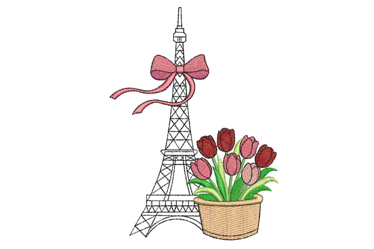 This elegant Eiffel Tower embroidery design features a soft pink bow and a charming tulip basket — perfect for spring décor, kitchen towels, tote bags, pillows, and gifts.