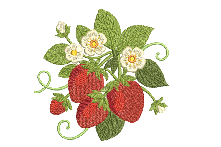 Sweet and timeless strawberry embroidery design featuring ripe berries, delicate blossoms, and textured leaves in a cottage garden style. Perfect for adding a soft, elegant touch to kitchen linens, tote bags, pillows, and more.