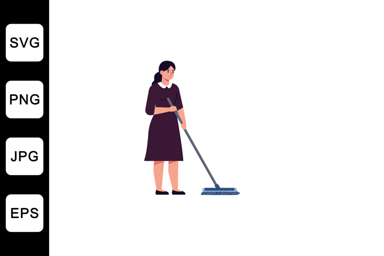Illustration Vector Art Style Woman Minimal Digital Broom Cleaning Floor