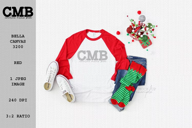 Bella Canvas 3200 Red White Unisex Raglan Christmas Mockup example image 1