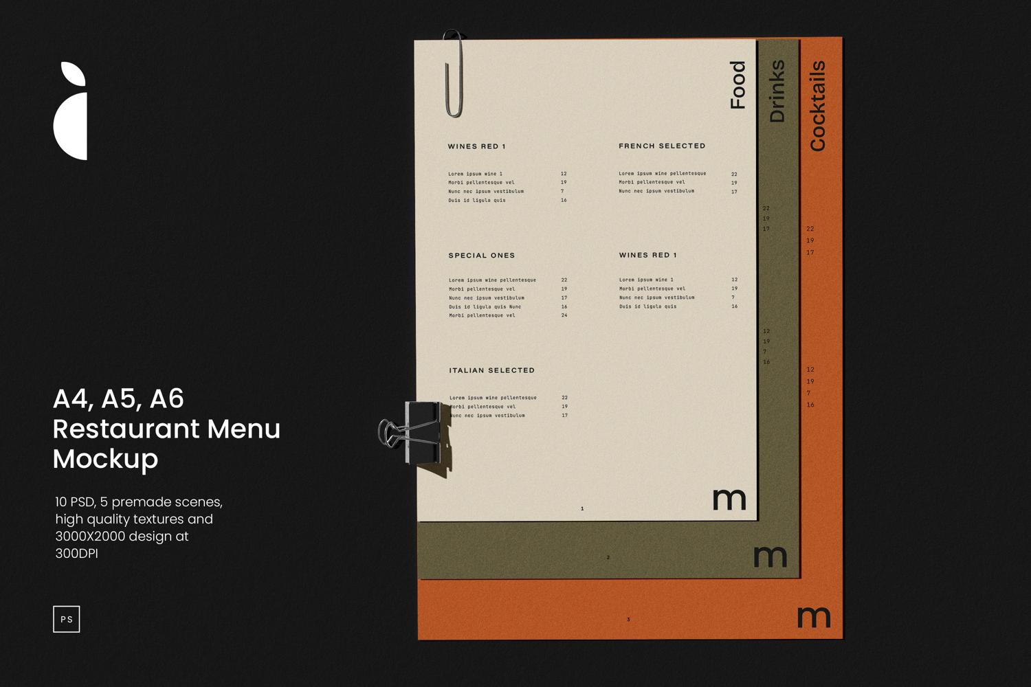 The package includes: 10 PSD Restaurant Menu Mockups in A4, A5 and A6 format. In detail, the following are included:
