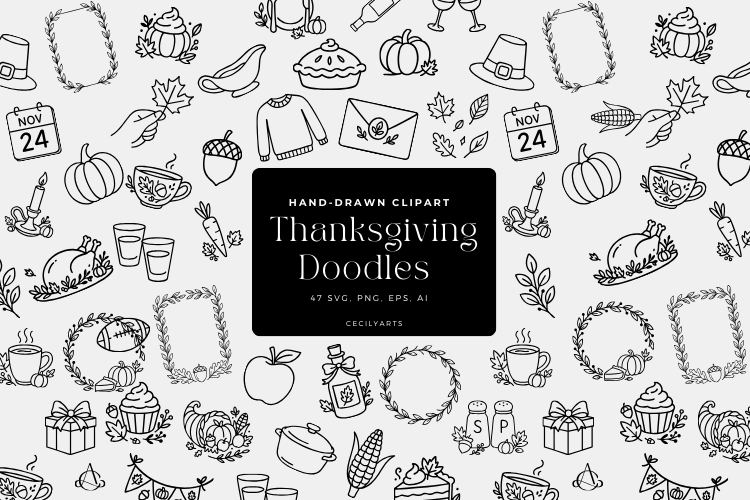 ✅ 47 unique hand-drawn Thanksgiving doodles