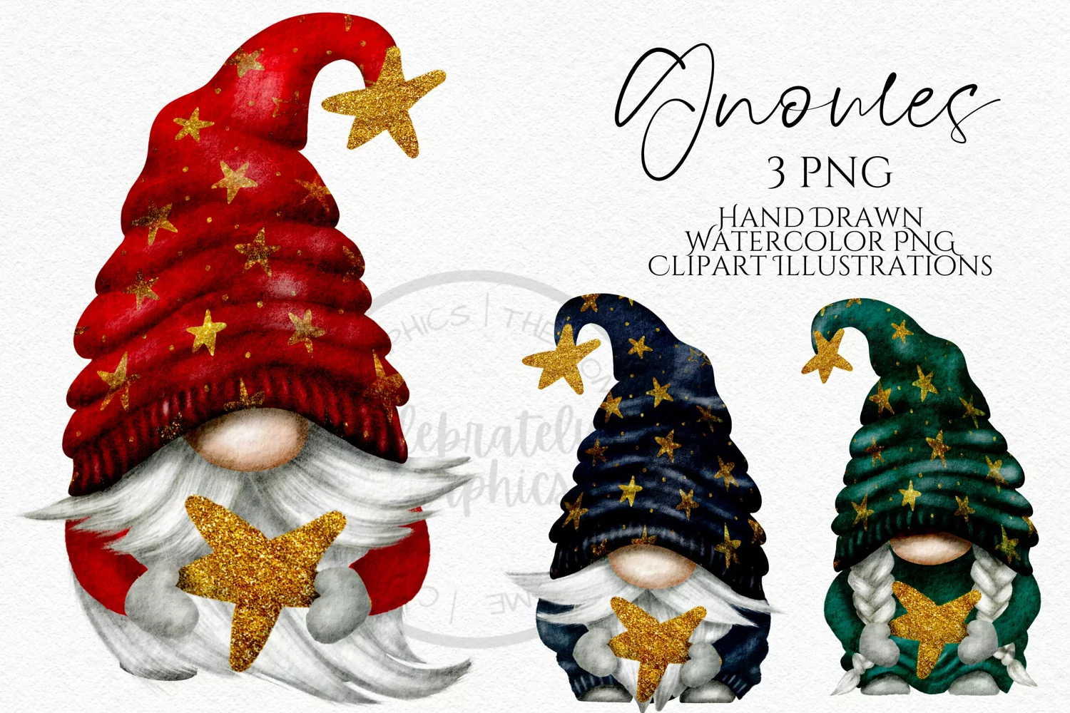 Hand-drawn watercolor gnomes in a watercolor. Brilliant for digital and print uses.