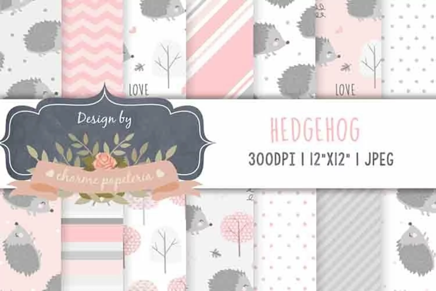 Hedgehog digital paper, Pink and Gray Digital Paper, Cute