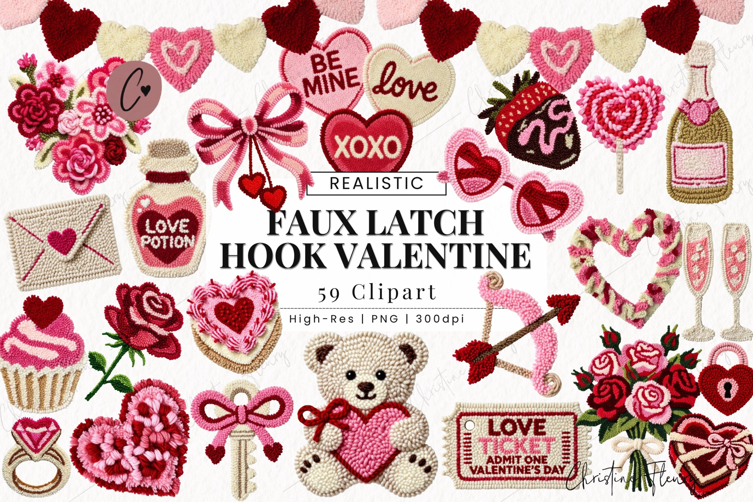 Faux Latch Hook Valentines Clipart Bundle includes 59 Valentines elements designed at a high resolution making them perfect for your print and digital projects. Easily use this clipart for your next Valentine's Day sublimation, digital designs, gifts, home decor, tumbler wraps, and so much more! Let’s get Creative!