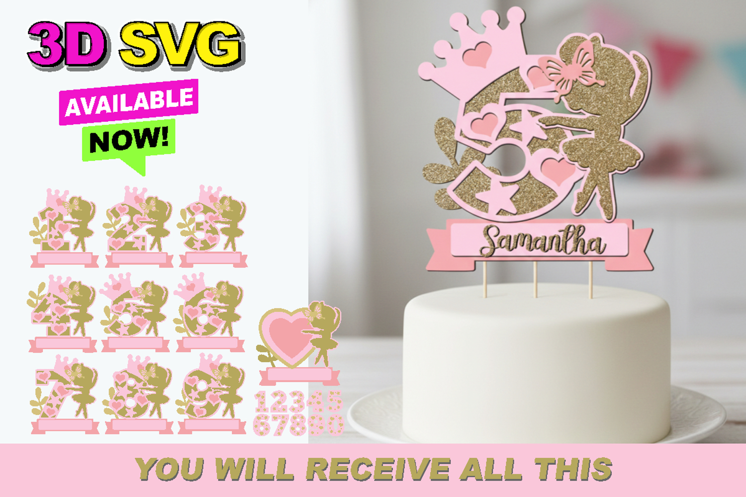 Multi-Layered Elegance: Experience a stunning 3D effect with stacked layers that bring the ballerina’s silhouette, the glittery number, and the decorative floral and heart elements to life.