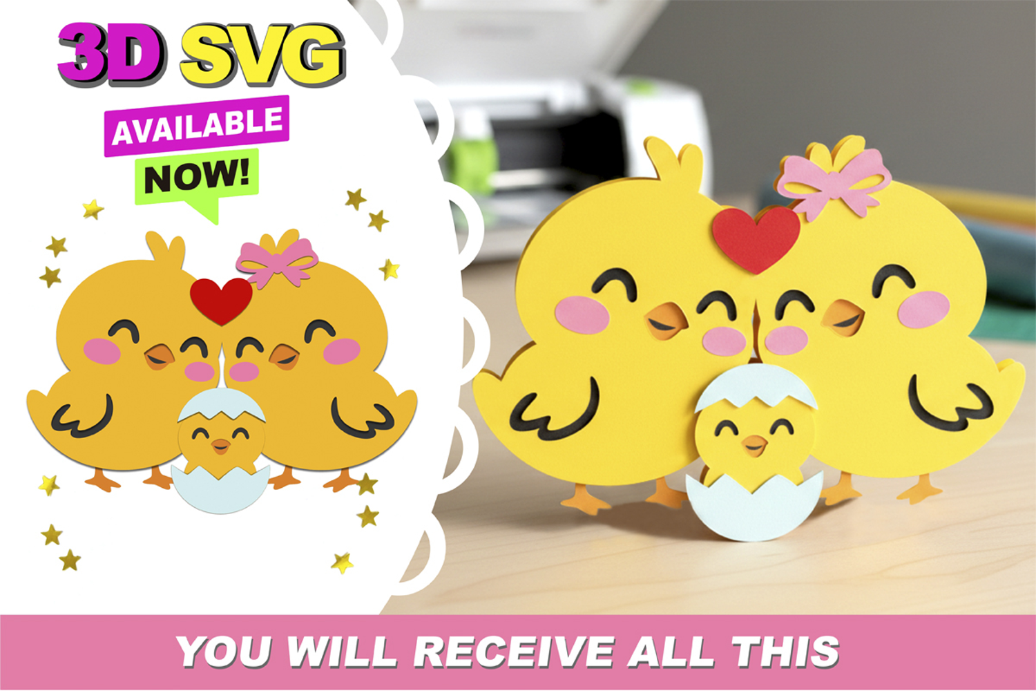 Add a burst of warmth and cuteness to your crafting projects with this adorable Chicken Family design. Part of our Baby Animals Collection, this 3D SVG features a charming pair of parent chicks welcoming their newest little one, designed to bring a touch of whimsy and joy to any handmade creation.
