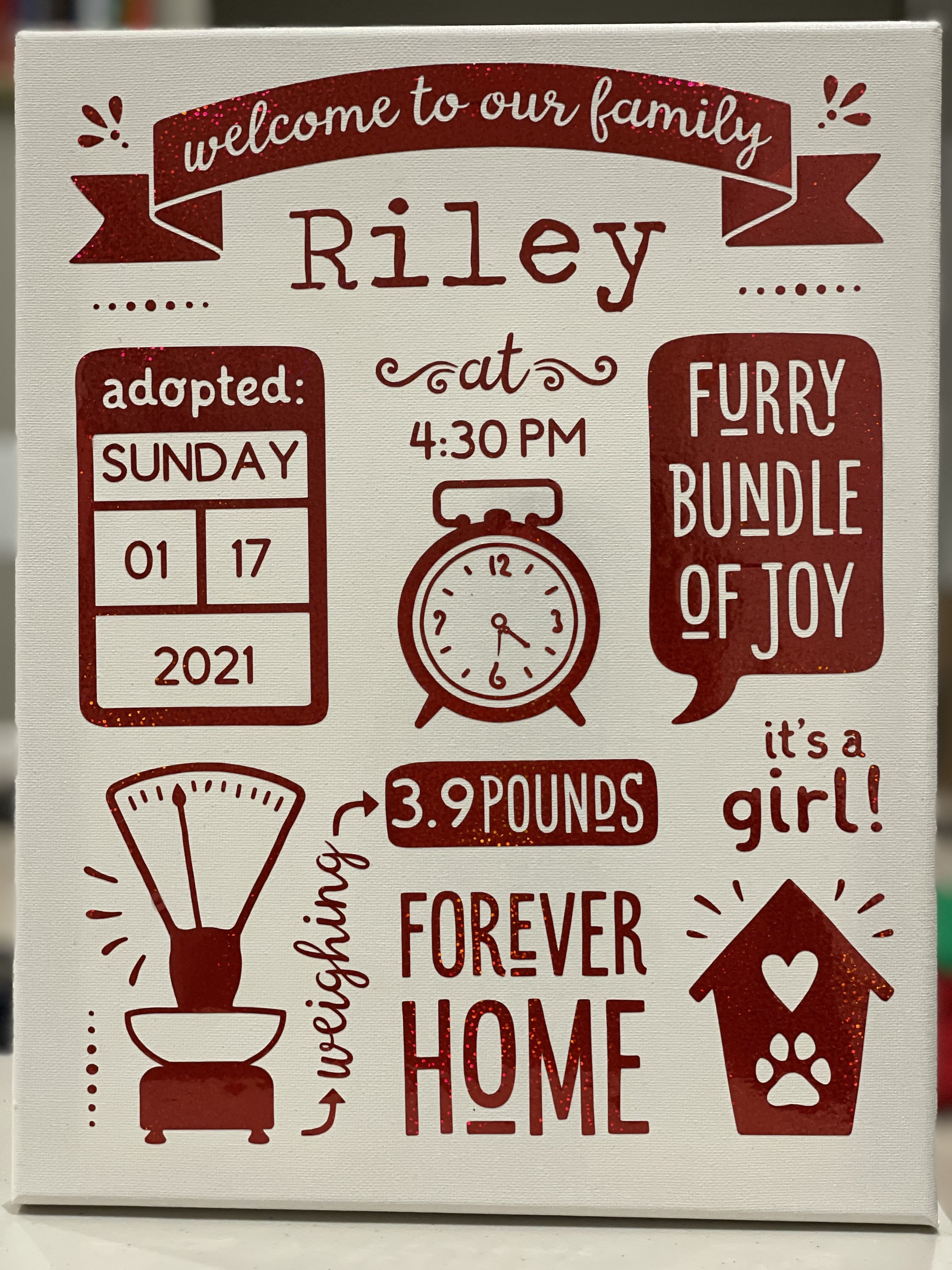 Announce your new puppy, rescue dog, cat or kitten to the world, make a sign for a pet photo shoot or use to create items to gift to forever homes in your pet rescue center! Simply install the linked free fonts and add your own info in the blank spaces.