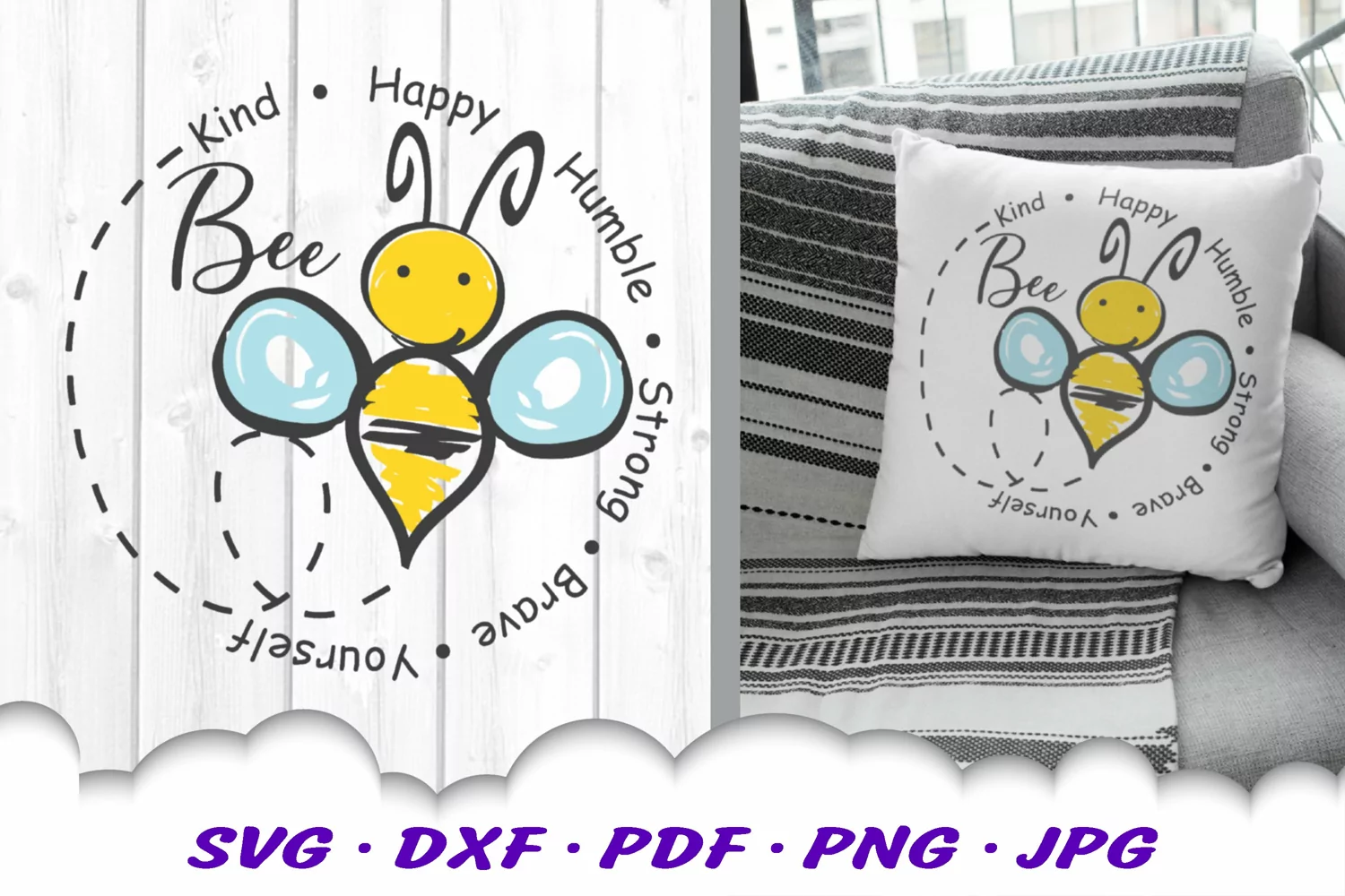 This digital download features our Bee Kind Bumble Bee SVG DXF Cut Files for Cricut, Silhouette, Cameo and other cut machines. A cute Bumble Bee surrounded by the word "kind', and other inspirational words for making festive shirts, cards, pillows, signs and other home decor and clothingツ