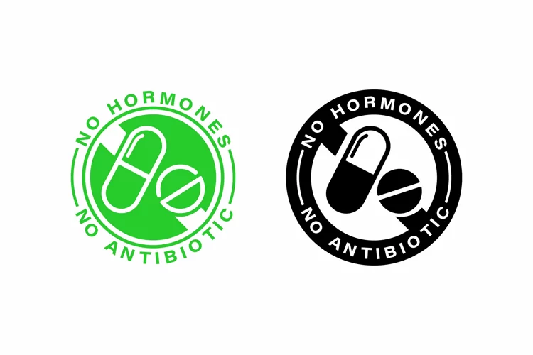 Certificate seal. No hormone. Natural product. Fresh nutrition. Healthy antibiotics free products. Vector on isolated white background. EPS 10