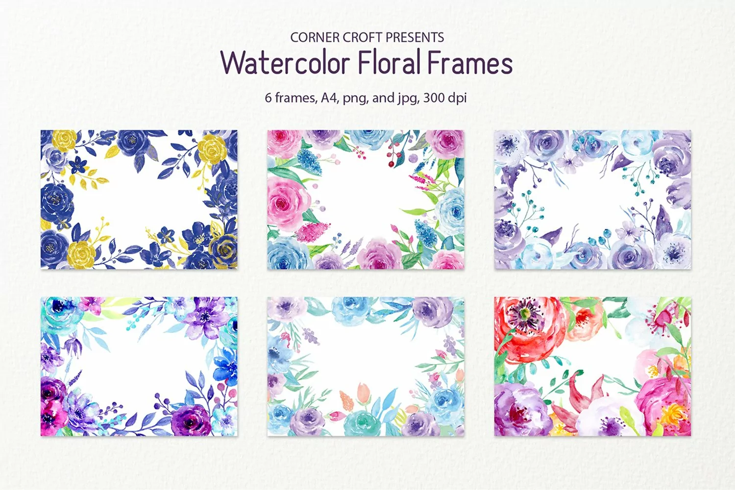 - 6 watercolor floral frames, png and jpg, 8.2"x 11.6" (A4), 300 dpi.