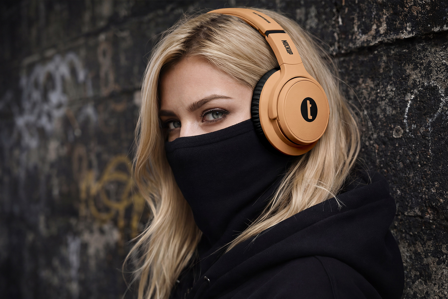 Display your brand identity in a natural environment. After all, the urban texture of the wall, soft daylight, and the model’s expressive gaze create an atmosphere of confidence and character. Moreover, this creates a natural and prestigious look for the logo on the headphones. Show your client a real-world product use case, not an abstract render.