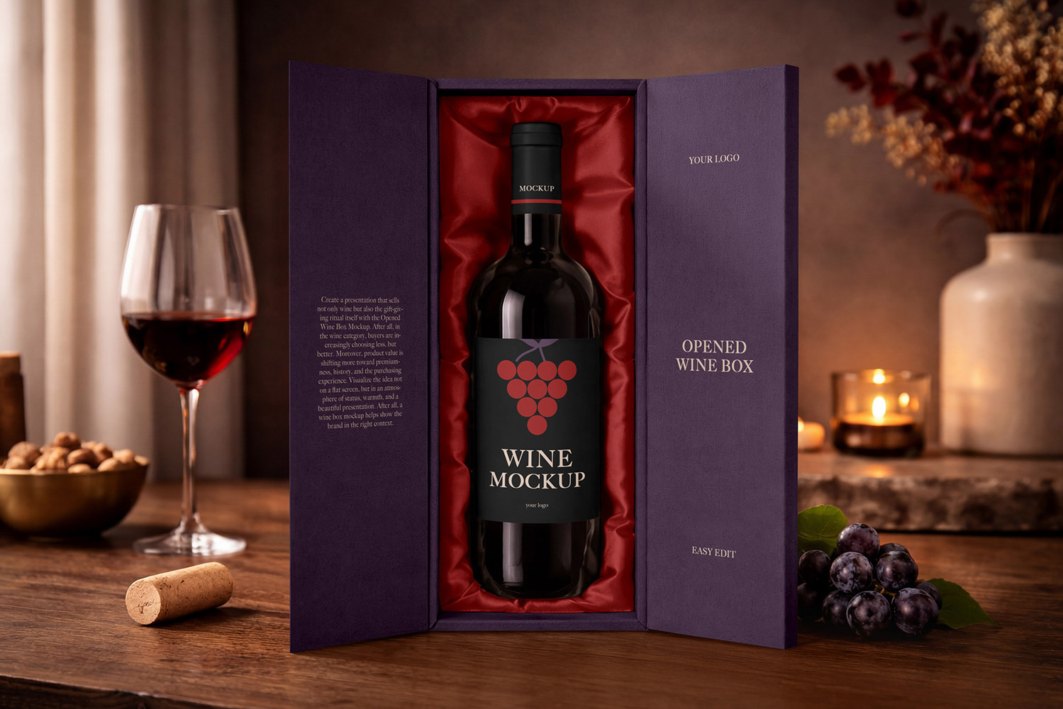 Create a presentation that sells not only wine but also the gift-giving ritual itself with the Opened Wine Box Mockup. After all, in the wine category, buyers are increasingly choosing less, but better. Moreover, product value is shifting more toward premiumness, history, and the purchasing experience. Visualize the idea not on a flat screen, but in an atmosphere of status, warmth, and a beautiful presentation. After all, a wine box mockup helps show the brand in the right context.