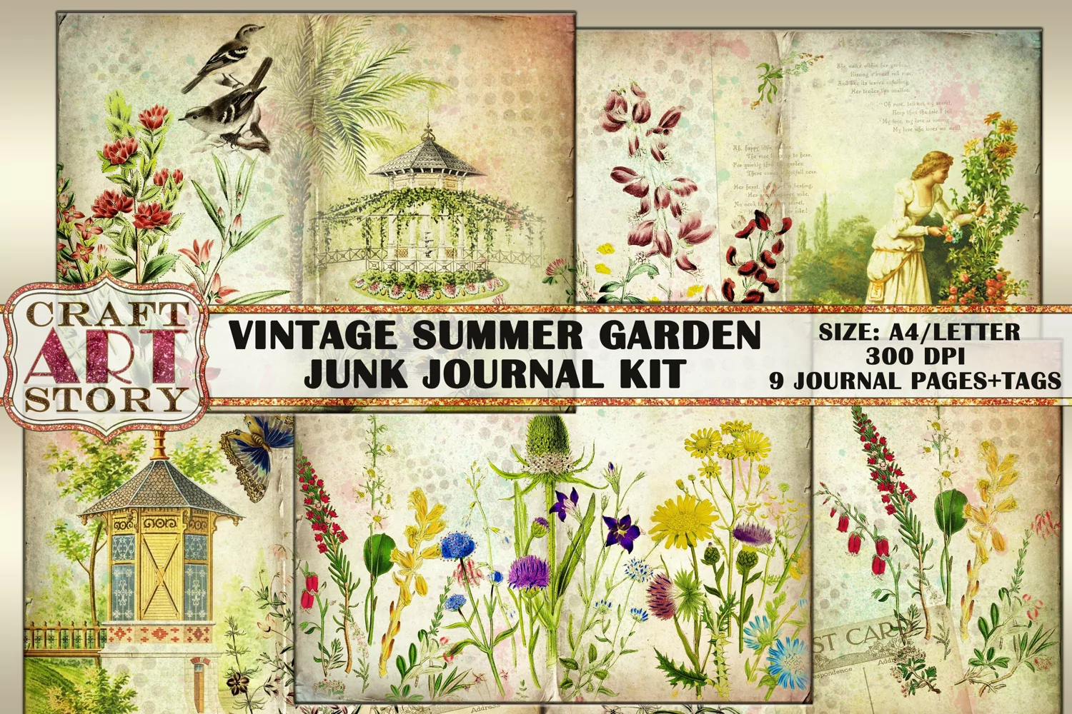 Vintage Digital Summer garden junk journal Kit