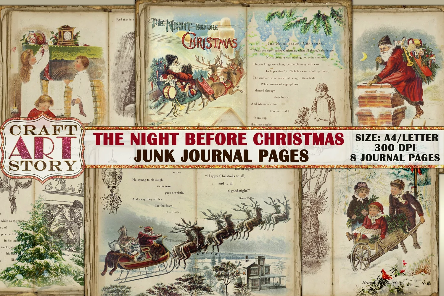Vintage Christmas Junk Journal Kit,Printable Collage Pages The Night Before Christmas
