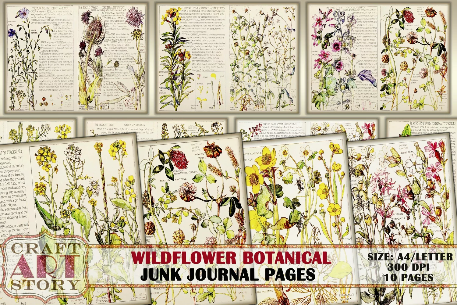 Vintage old paper Wildflowers Junk Journal Pages,backgrounds kit,decorative papers.