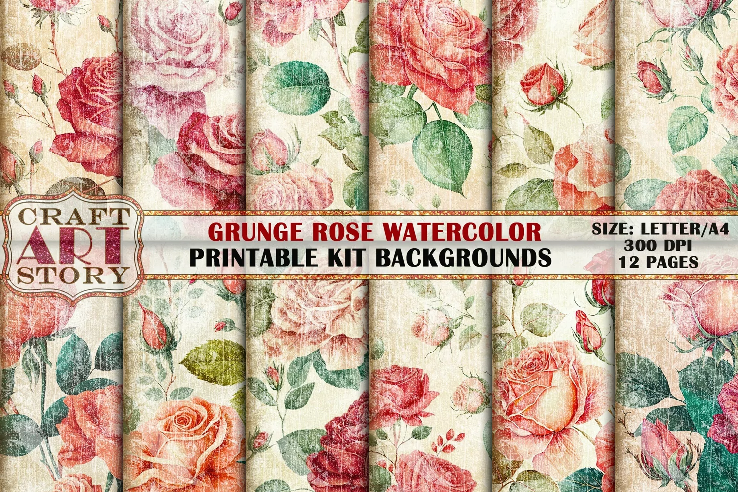 Grunge Pattern Papers,Watercolor Roses Backgrounds Printable example image 1
