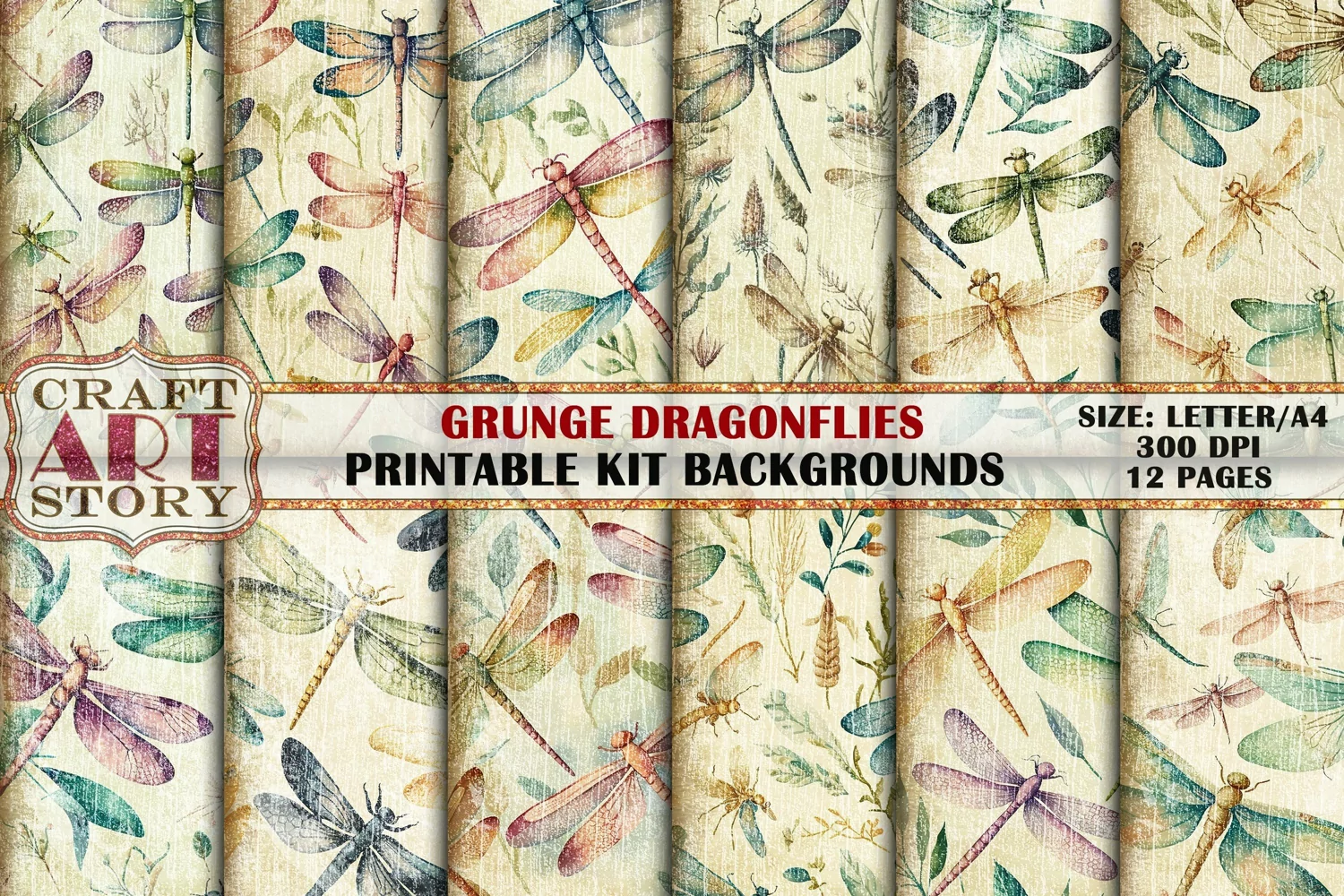 Grunge Pattern Papers,Watercolor Dragonflies Backgrounds Printable 12 Pages