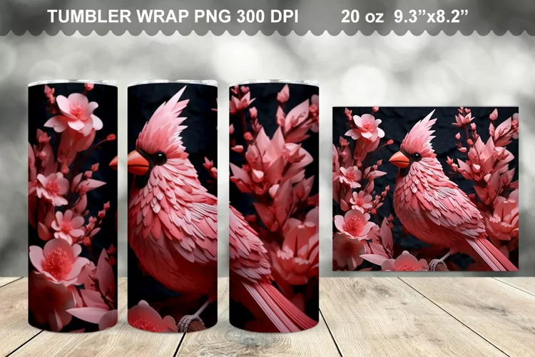 Pink 3D Cardinal Bird Flowers Tumbler Design