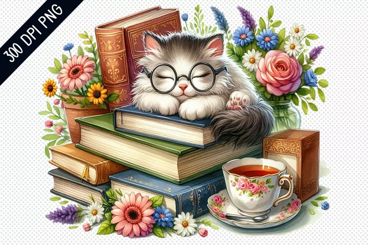 Books And Sleeping Cat Sublimation - Clipart PNG Design example image 1