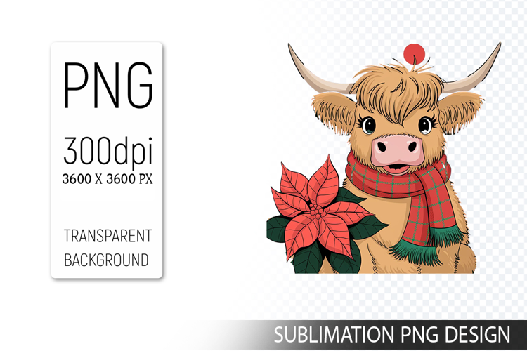 Cute Christmas Highland Cow , Animal Sublimation Clipart PNG example image 1
